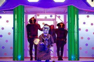 einer Hexe, die sich bereits als Männlein im purpurnen Mäntelchen in die Handlung eingemischt hat. Rosie Aldridge gelingt das pompös Damenhafte, könnte als Hexe jedoch etwas unheimlicher sein. Sie ist die wahre Herrscherin in dieser Welt, sie führt ein großes Chemieunternehmen, durch das die Menschen mit den kleinen bunten Talern satt gemacht und bei Laune gehalten werden, Produkte, die ähnlich wie Soylent Green im Kinofilm aus den Leichen von Kindern gewonnen werden, die vom Fließband oben in die Fabrik geschleudert werden und unten zu Talern geschreddert landen.