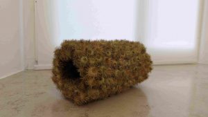 Man kann natürlich auch unmittelbar auf die Natur zurückgreifen und deren Erzeugnisse in Kunst verwandeln. So formte Pauline Adler aus Flugsamen überdimensionale Tropfen und gibt auch immer wieder an, woraus ihre Werke bestehen: aus Samen der Artischocke, der Distel. Aus aufgelesenen Piniennadeln gestaltete sie eine Hommage an einen Urlaub: „Kretische Tagebücher“. Und Clematissamen auf einer Platte unter einer Plexiglashaube scheinen geradezu ein kleines Ballett aufzuführen. So wird Natur unmittelbar in künstlerische Gestaltung überführt. Dabei geht Pauline Adler immer wieder auf das Wesen ihrer der Natur entnommenen Materialien ein: So tun Kletten bei ihr das, was sie nun einmal aufgrund ihrer Beschaffenheit tun: Sie hängen aneinander und bilden Matten, aus denen sogar so etwas wie Kleidungsstücke geformt sind. Pauline Adler, Muff, 2024