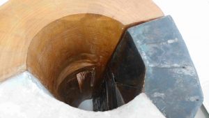 Das ermöglicht Waltraud Späth in zahlreichen ihrer Arbeiten dem Besucher der Ausstellung auch ohne das Medium Film. Sie gestaltet Verbindungen – Annäherungen, die auf den ersten Blick wie ein Widerspruch wirken: Bei ihr trifft Natur – in Form von Holz – auf Menschengemachtes, auf Industrielles – auf Beton und Stahl. Und siehe da: die einander so fernen Stoffe scheinen sich zu mögen, gehen gar enge Verbindungen ein und bleiben doch stets, was ihrem Wesen entspricht: Naturgewachsenes, ehemals Lebendiges, und Menschengemachtes, Totes – Holz sowie Beton und Stahl.